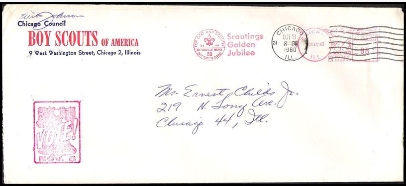 On Chicago Council corner card with red "Scoutings Golden Jubilee" meter.