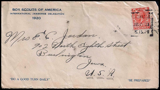 Hillcourt attended the US Jamboree & then carried this stationery to the World Jamboree.   He sent this example to himself.