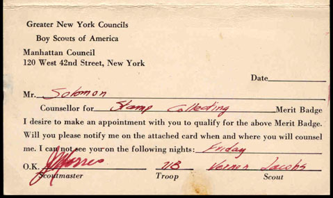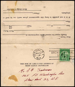 In the past, Scouts were responsible for making arrangements with merit badge counselors themselves. Arrangements included the preparation of both appointment & application cards, some of these being designed for mailing. However, mailing was not required and the majority never were.